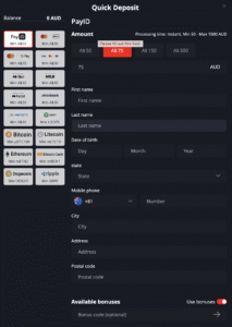 Just register an account, complete KYC, open the Cashier page, and choose a payment method – PayID, cards, or crypto, make a deposit, and confirm the operation.